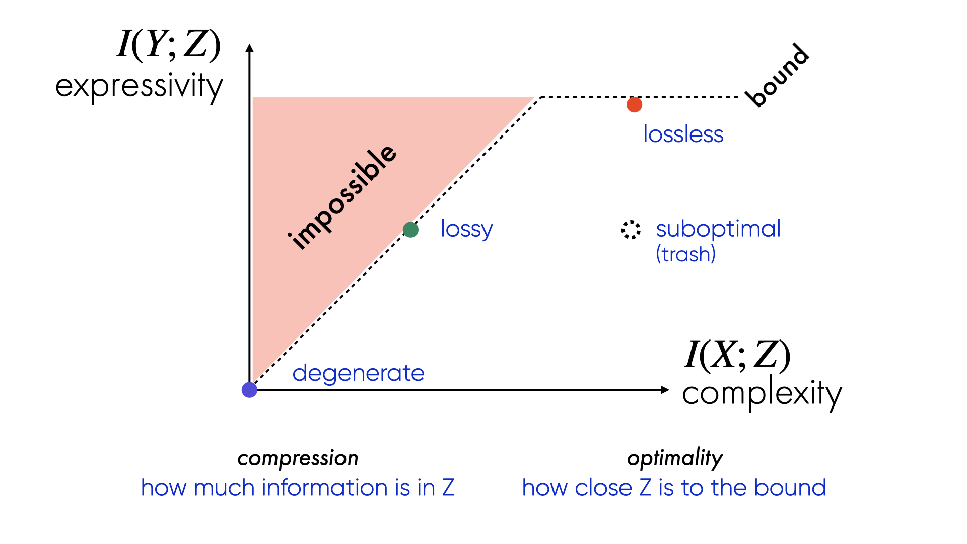 plotted on the information plane a lossless compression maxmises expressivity at the cost of complexity. a good lossy compression sits close to the information bottleneck bound — it throws away as much as possible while keeping information about the goal (expressivity) high. a suboptimal compression has the complexity of the lossless case but much lower expressivity — it preseerves information that isn’t needed for the task.