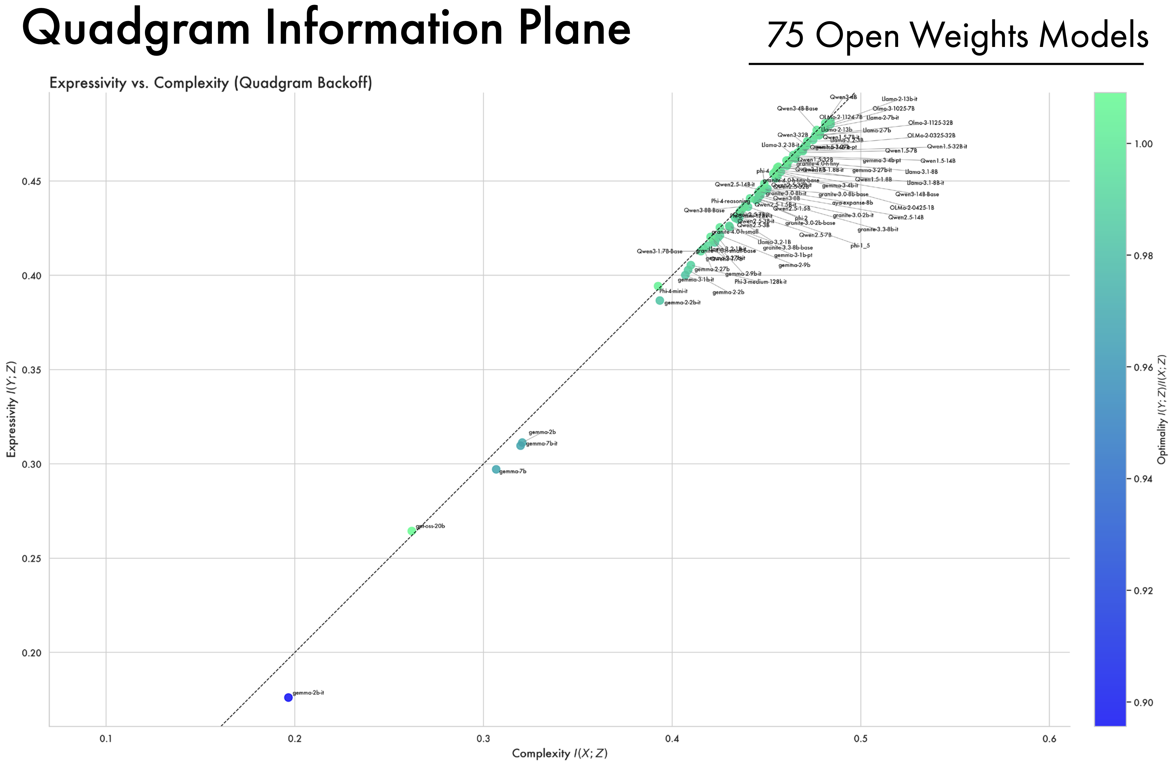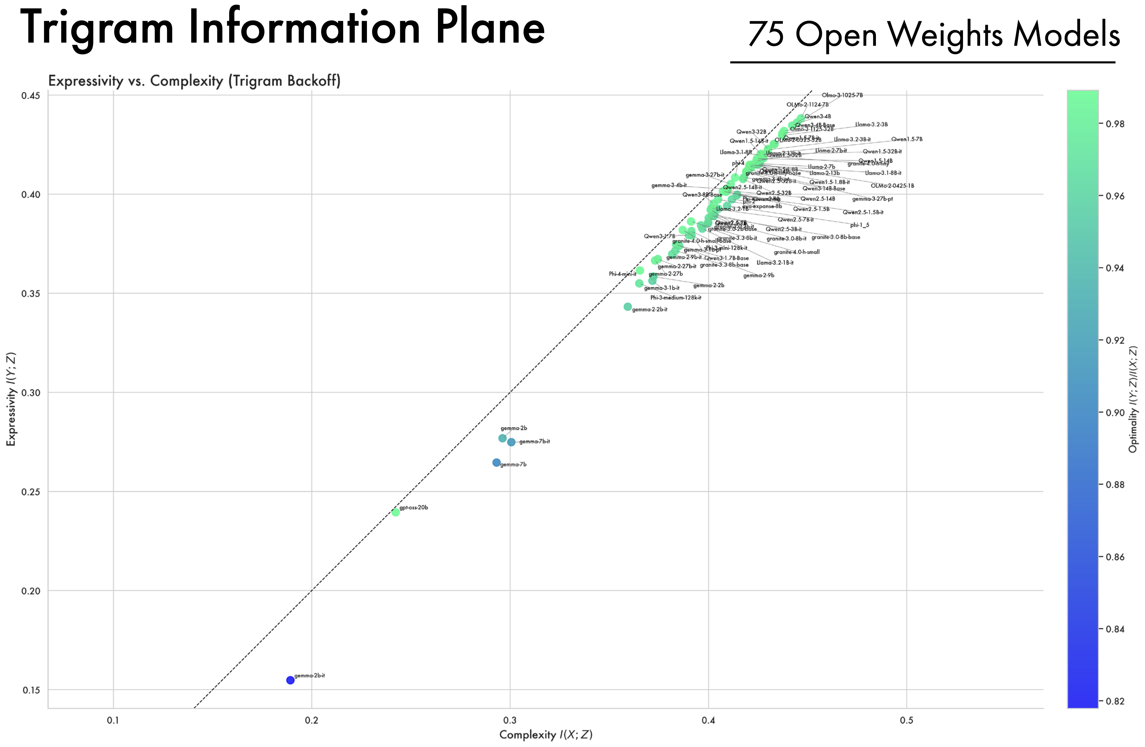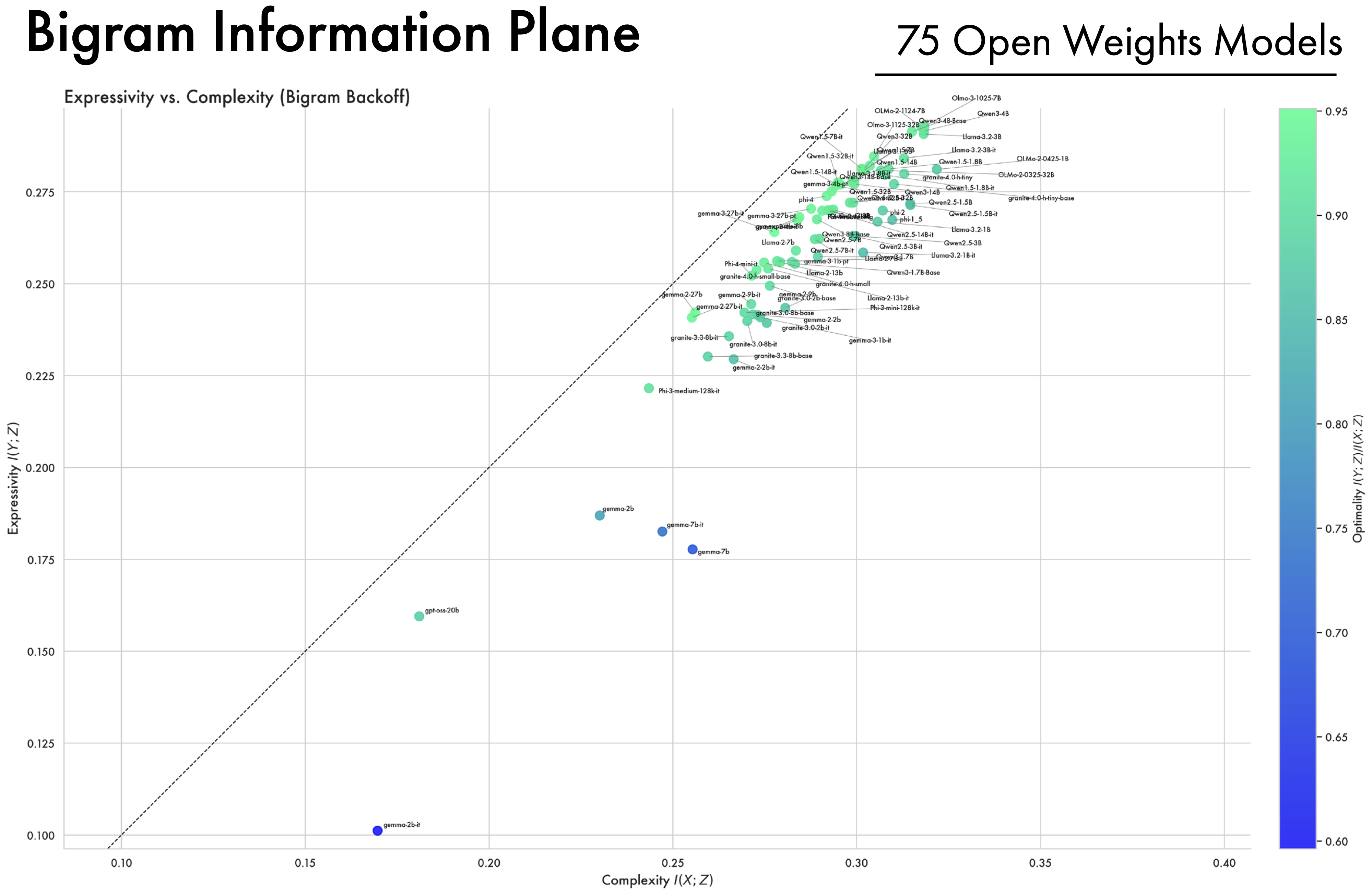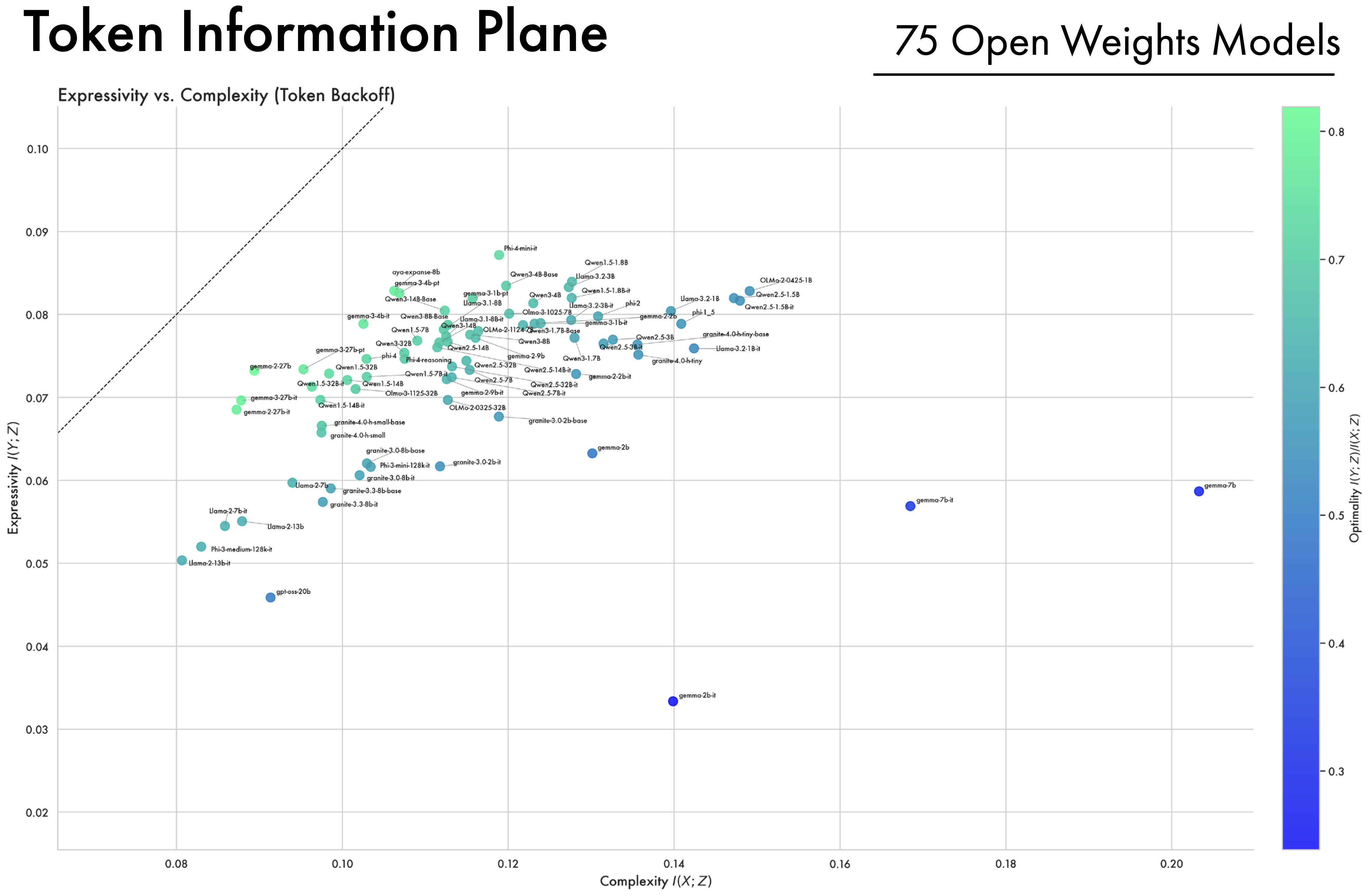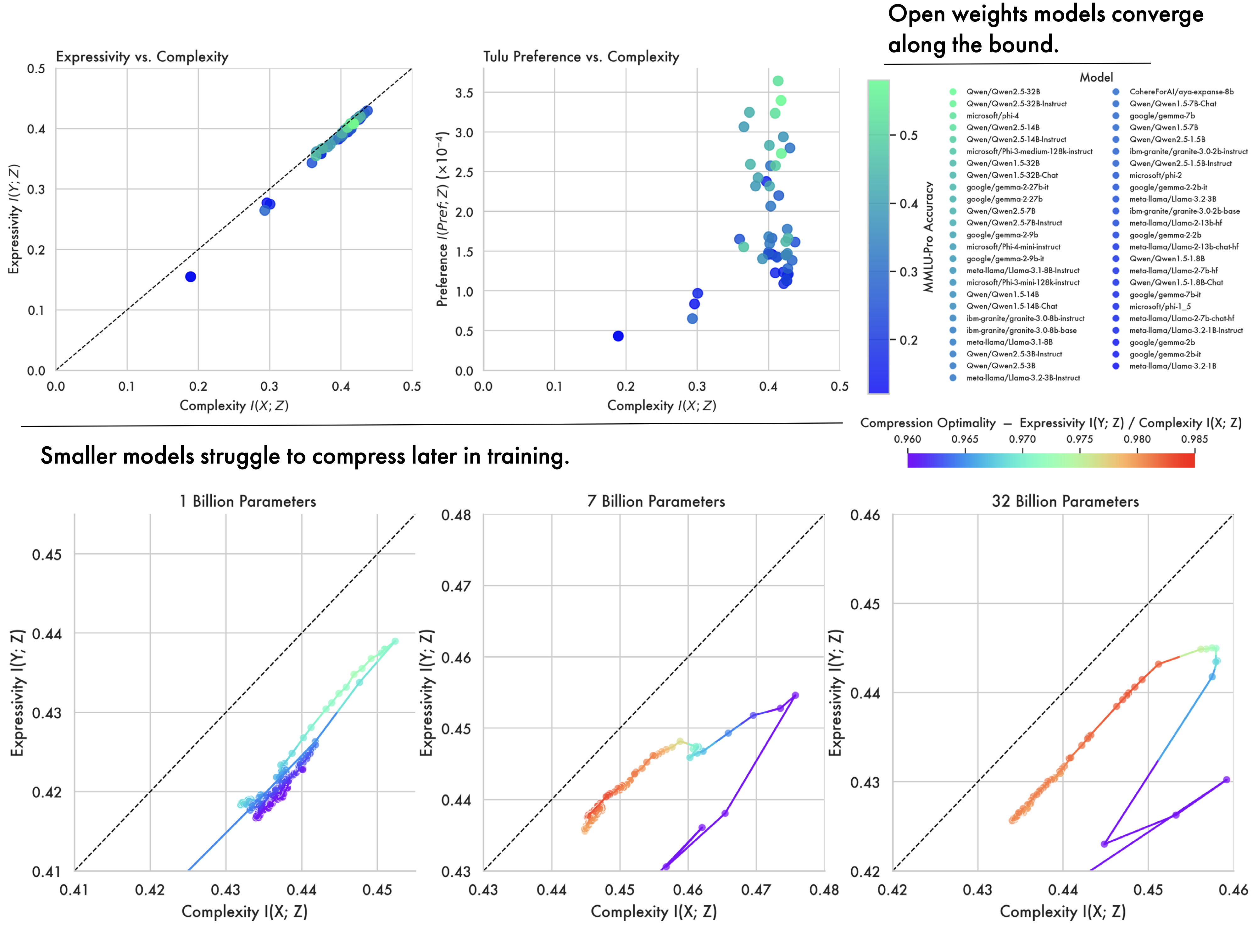 A Wide Array of Open-Weight Models Converge Along the Bound. In addition to looking at the OLMo2 family of models, we compute complexity and expressivity estimates across a diverse array of open-weight models. A striking convergence pattern emerges: across different model families, hyper-parameters, and training methodologies, representations ultimately converge and cluster near the bound on compression. Furthermore, models all approach the same point on the bound, suggesting they all converge to a similar information structure. This suggests that training as a process of compression is not an artifact of a single LLM’s training trajectory, but more fundamentally applies to deep-learning models as a class, and to the data and the objectives used to train them.