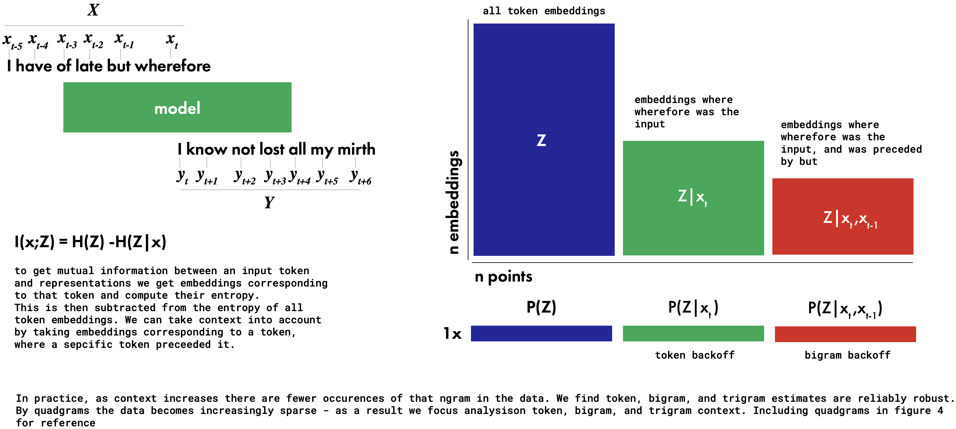 This brings us to an important distinction: our analysis discusses mutual informations with respect to tokens, bigrams, trigrams, and quadgrams. These are not computed over different widths of embeddings, but rather over single token embeddings conditioned on the preceding context. It means that \(Z|\text{token}\) is a subset of \(Z\), \(Z|\text{bigram}\) is a subset of \(Z|\text{token}\), \(Z|\text{trigram}\) is a subset of \(Z|\text{bigram}\), etc. The terms token, or bigram mutual informations refer to the width of the conditioning context, not the width of the embeddings over which entropy is computed.