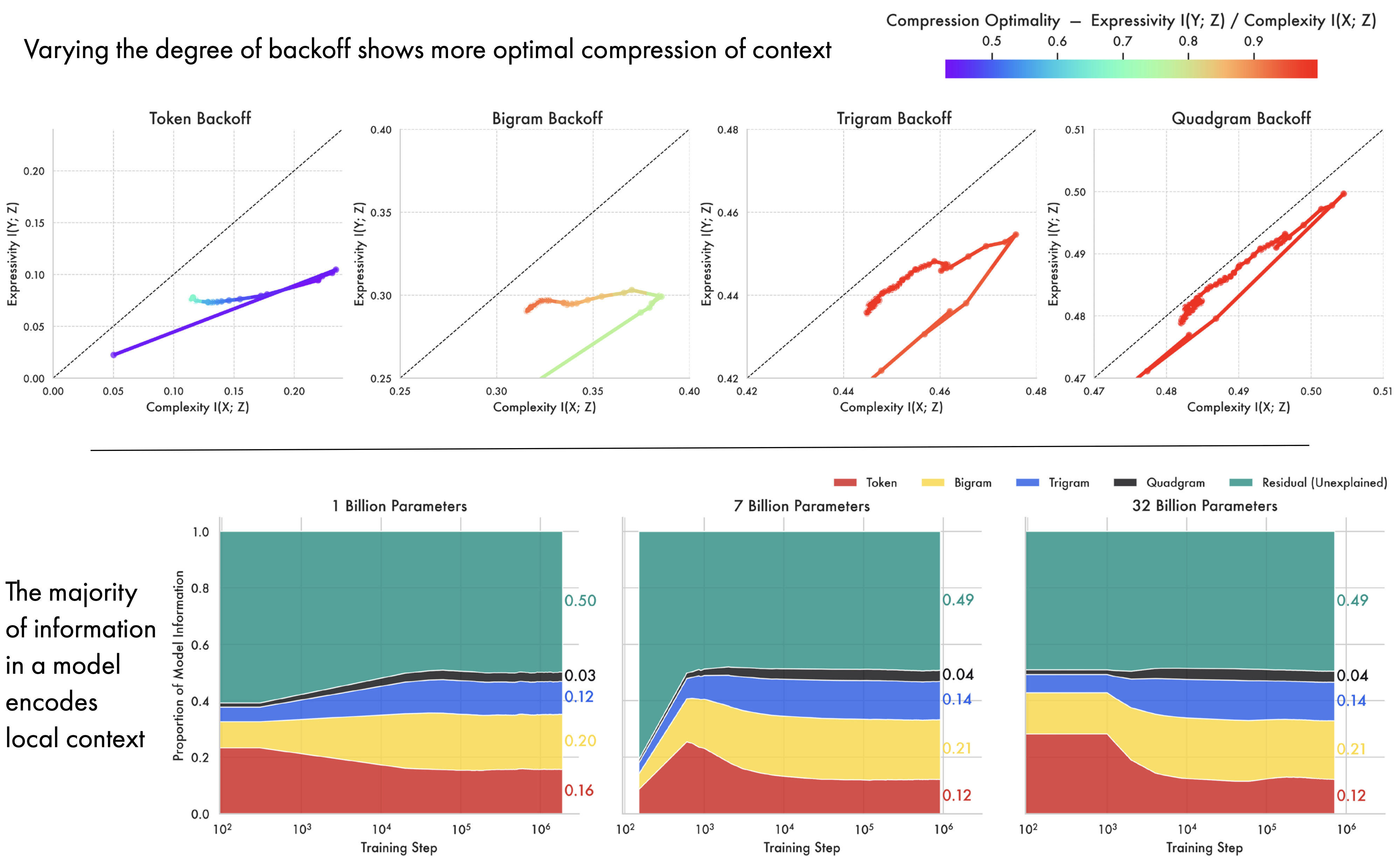 Models More Optimally Compress Contextual Information. By varying the degree of back-off in the source and target distributions used to compute mutual information, we can examine how contextual information evolves over pre-training at the token, bigram, trigram, and quad-gram levels. All cases result in a similar two-phase pattern of expansion and compression, with larger conditioning context converging closer to the bound. For token-level back-off late training aligns with previous work on MNIST (Shwartz-Ziv and Tishby 2017), with models compressing the source distribution — reducing complexity — while maintaining expressivity. At higher levels of contextualisation both complexity and expressivity are reduced. We hypothesise this is because in language modelling the source and target are sampled from the same distribution; what counts as an ‘input’ vs. an ‘output’ is a product of what point in the sequence the model is during generation. The higher degree of optimality in contextual encodings likely reflects an inherent pressure in the pre-training objective for models to develop representations of a token in context.