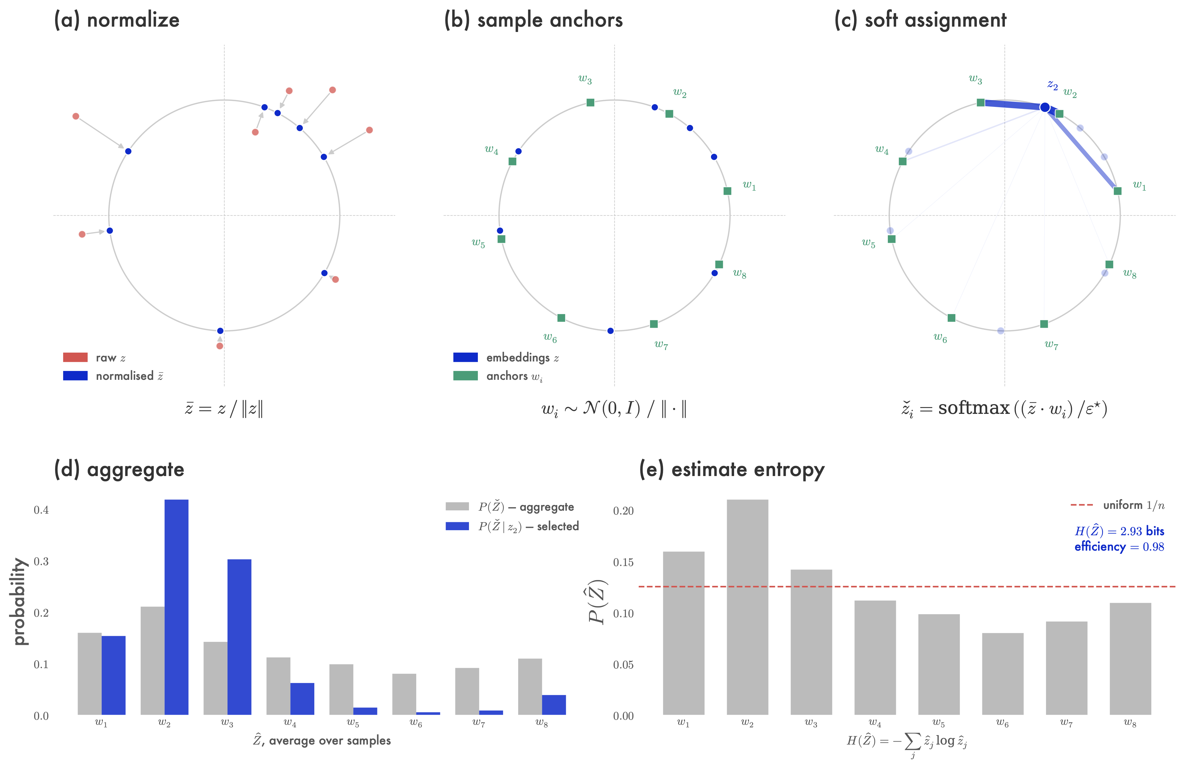 We first compute \(\bar{Z}\), the normalization of \(Z\) to lie on the surface of the unit sphere \(\mathbb{S}^h\) in \(\mathbb{R}^h\). Then we compute \(W\) by sampling \(n\) points \(\{w_i\}_{i=1}^n\) uniformly at random from \(\mathbb{S}^h\).3 For each normalized representation \(\bar{z} \in \mathbb{R}^h\), we compute a vector whose \(i^{th}\) entry is the cosine between \(\bar{z}\) and \(w_i\), then apply softmax to that vector — softly assigning each embedding \(\bar{z}\) to the points in \(W\). More formally, each \((l,b,s) \in [L] \times [B] \times [S]\) tensor \(\bar{Z}\) (whose shape coincides with \(Z\)) is defined so that \(\bar{Z}_{l,b,s, :} = Z_{l,b,s, :} / \| Z_{l,b,s, :} \|\), and we stack the uniform samples \(\{ w_i\}_{i=1}^n\) into a matrix \(W \in \mathbb{R}^{h \times n}\). The soft-quantisation of \(Z\) is then given by \(\check{Z} \in \mathbb{R}^{L \times B \times S \times n}\) for \((l,b,s) \in [L] \times [B] \times [S]\):