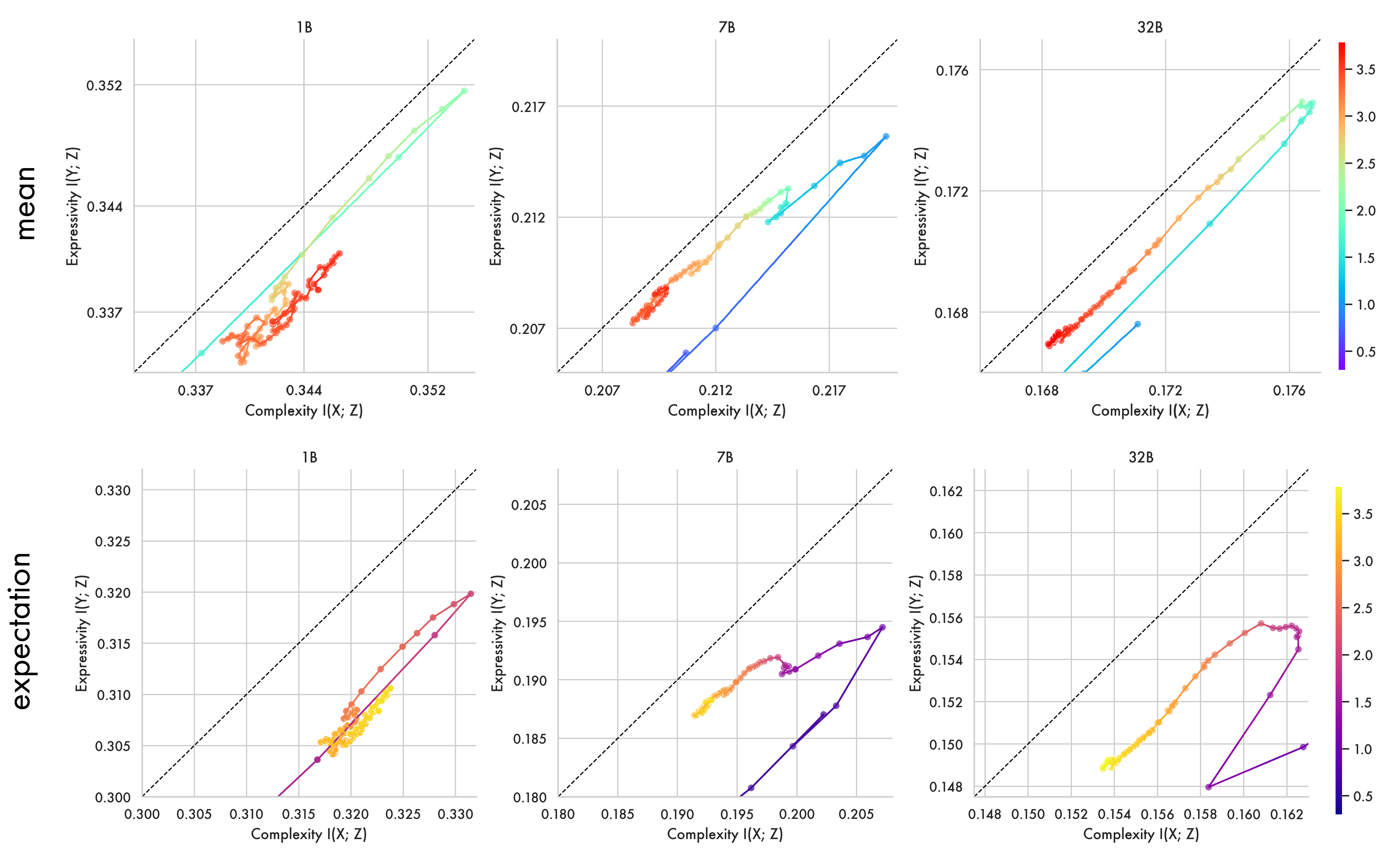 The Effect of Scale: Smaller Models Struggle to Compress. Parameter count shows a marked effect on the degree of compression achievable by a model. The larger models both closely follow the hypothesized Information Bottleneck trajectory, exhibiting phases of expansion and compression, ultimately approaching optimal compression. The 1B parameter model exhibits markedly different behaviour. While it successfully completes the initial expansion phase — increasing output information \(I(Y;Z)\) — it fails to approach optimal compression. Instead, in the second phase the smaller model oscillates while moving slowly away from the bound. This suggests that for a given level of data complexity, a certain parameter threshold may be necessary for models to achieve an optimal compression — an observation in line with work on scaling laws (Kaplan et al. 2020).