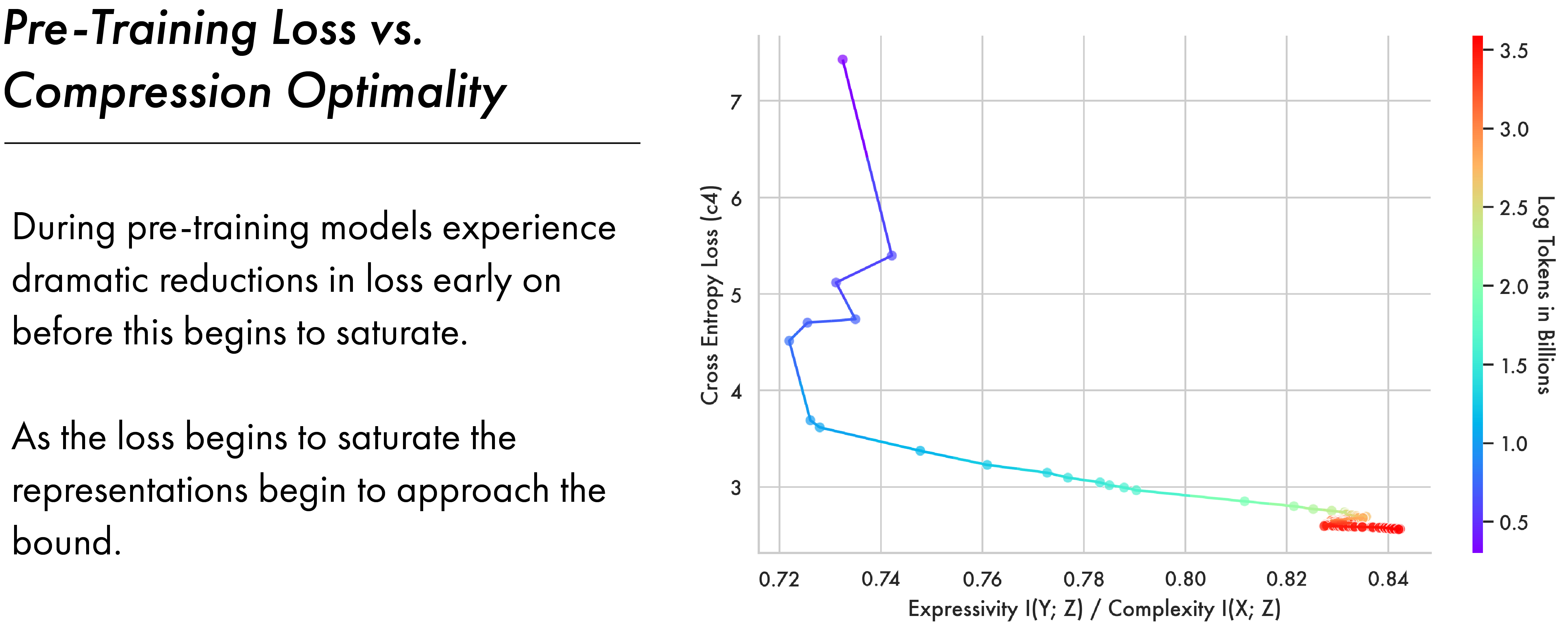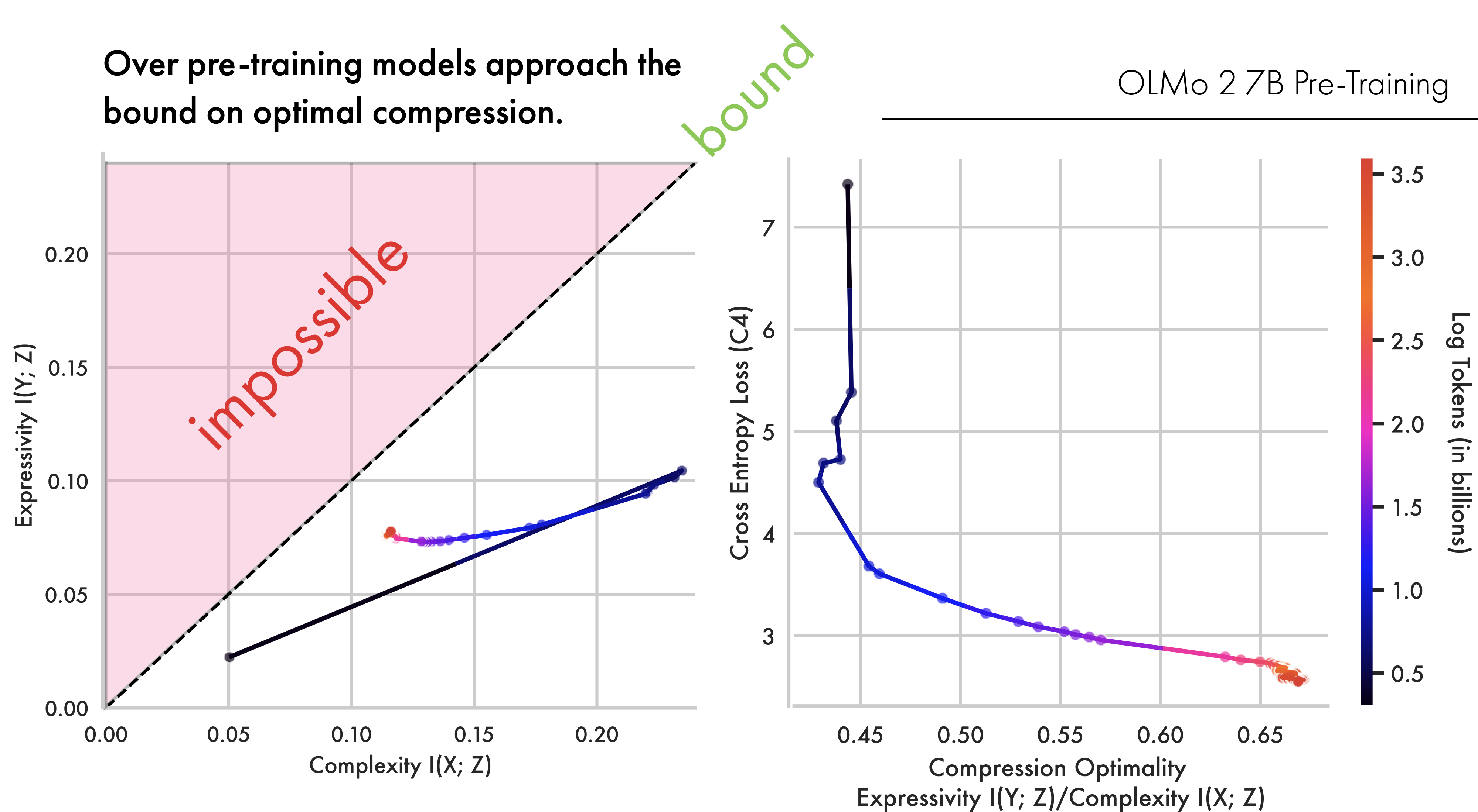 Shown in Figure 1 (and reproduced below) is the training trajectory for the OLMo2 7B model with respect to data from English C4. Strikingly, the 7B model closely follows the two-phase prediction from the Information Bottleneck, first increasing mutual information with outputs, before compressing input information and progressing towards the bound on optimal compression. Additionally this transition appears to happen as the model’s loss on next-token prediction begins to saturate. This shows how, even at scale, deep-learning models appear to thread a needle between representational complexity and expressivity. It also demonstrates how LLMs can be effectively studied from the perspective of Rate Distortion Theory, as they try to converge to an optimal lossy compression of their training data.