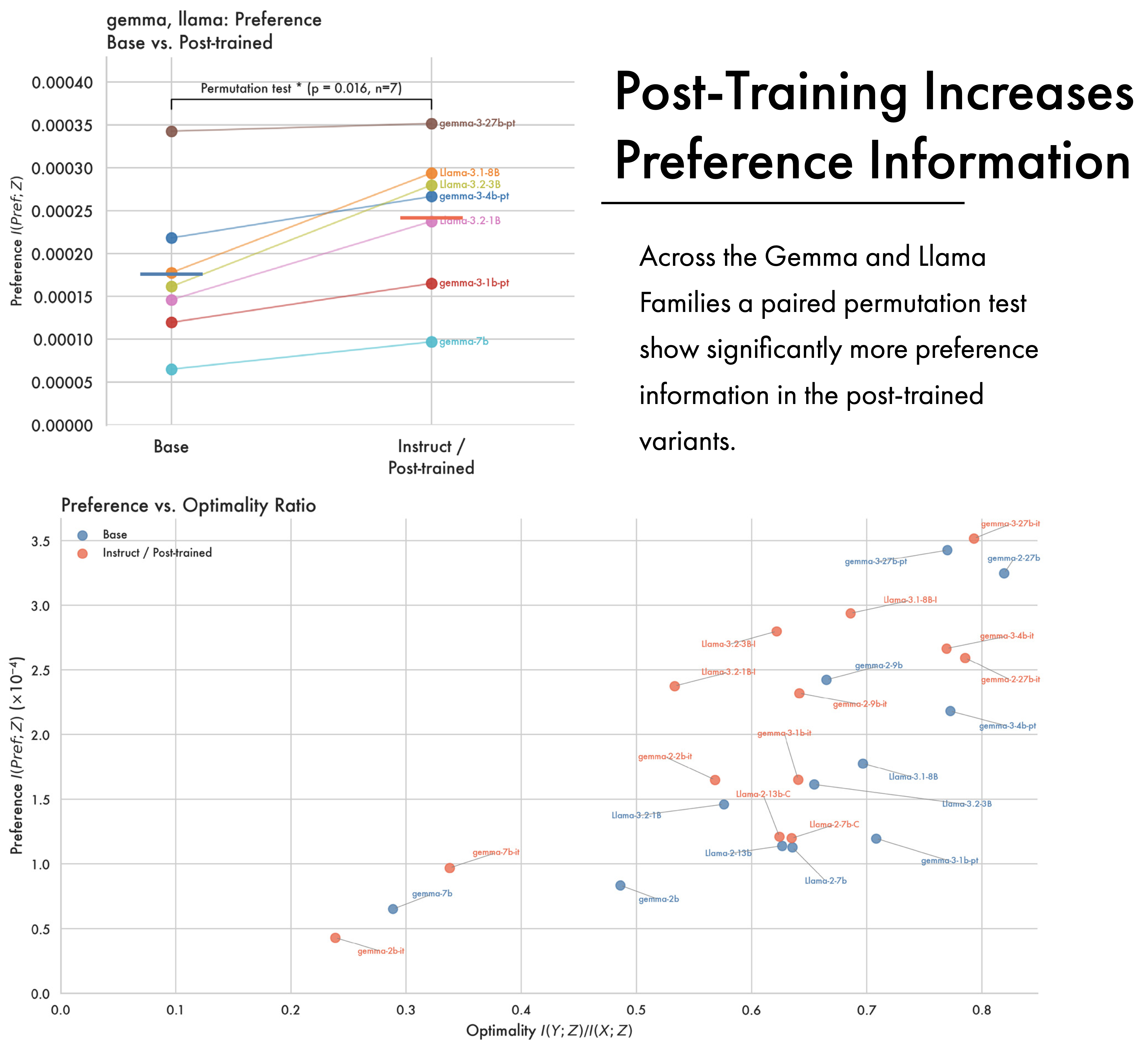 While LLMs become optimally compressed for next sequence prediction over pre-training, the final phase of the training pipeline often introduces other kinds of information. In the general case, post-training is designed to improve a model’s ability to follow instructions and better align it with human preferences; we look at how this changes the information content of a model, and how it affects the representations from pre-training. The figure above shows preference information across two different families of open weights models, Llama and Gemma, which release a checkpoint at the end of pre-training and one at the end of post-training. In the Llama case post trained models consistently have higher preference information than their pre- and mid-trained counterparts. This supports a framing of pre-training as imbuing the model with core semantic information, which is later augmented with task-specific and preference information. With the Gemma models the picture is more complicated, with a consistent effect for the most recent Gemma 3 release — post trained models have greater preference information — but no significant pattern across earlier models.