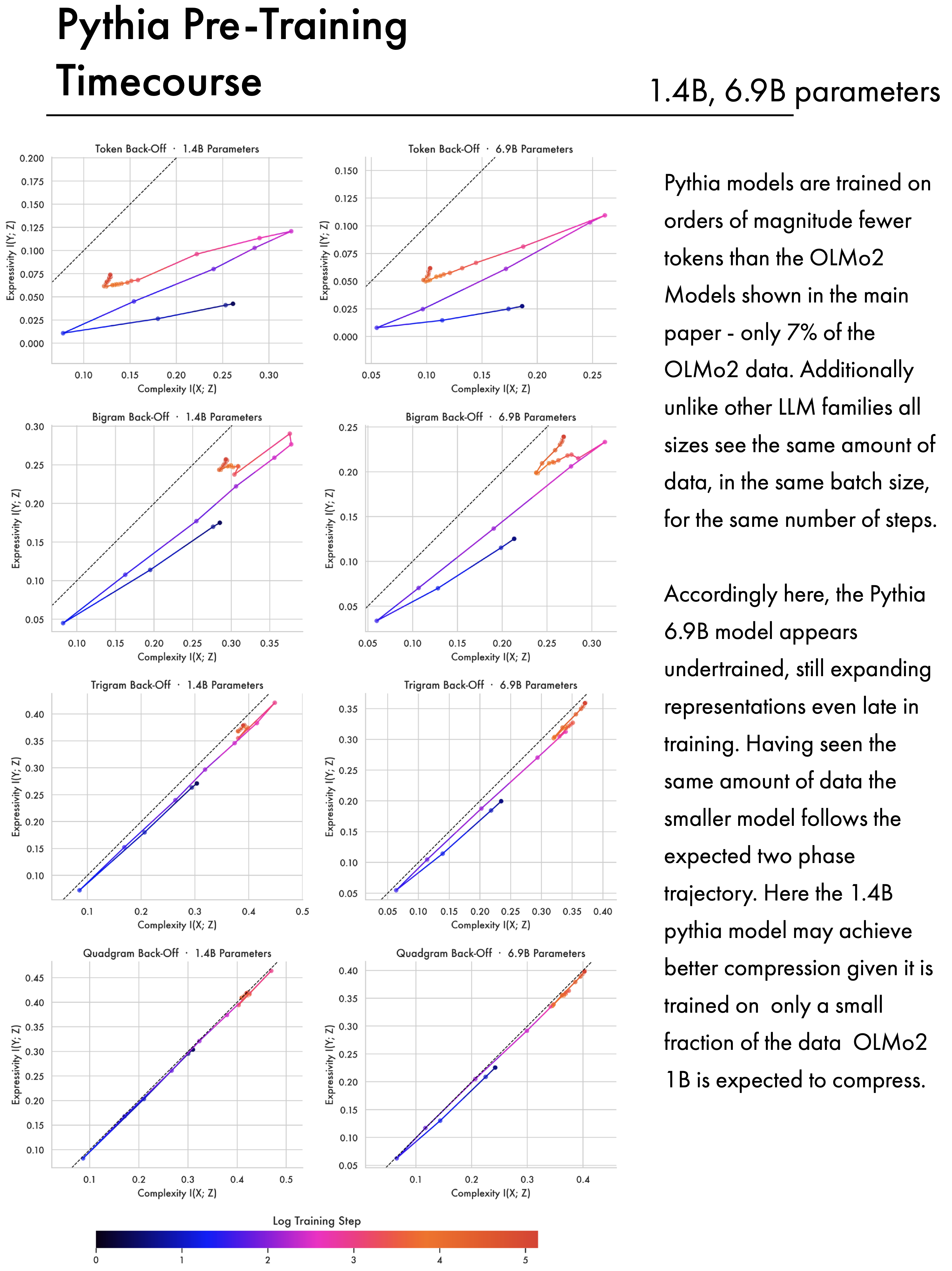 The other family of models we analyse are the Pythia models (Biderman et al. 2023). Included are analyses of the 1.4B and 6.9B models. In terms of parametrisation these are roughly comparable to the 1B and 7B OLMo2 models analysed in the main paper. However the methodology for training these models is substantially different, and their performance is substantially lower than the OLMo2 models. Pythia models are intended for scientific analysis — as a result they use the same amount of data, batch size, and number of training steps across model sizes, and are trained on the Pile dataset (L. Gao et al. 2020). This contains roughly 300 billion tokens; by contrast the 1B OLMo2 model is trained on 4 trillion tokens — meaning the Pythia models see 7.5% of that data. Accordingly the 1.4B Pythia model appears to achieve better compression later in training than its OLMo counterpart. The 6.9B Pythia model is still expanding representations late into pre-training, suggesting it is under-trained.