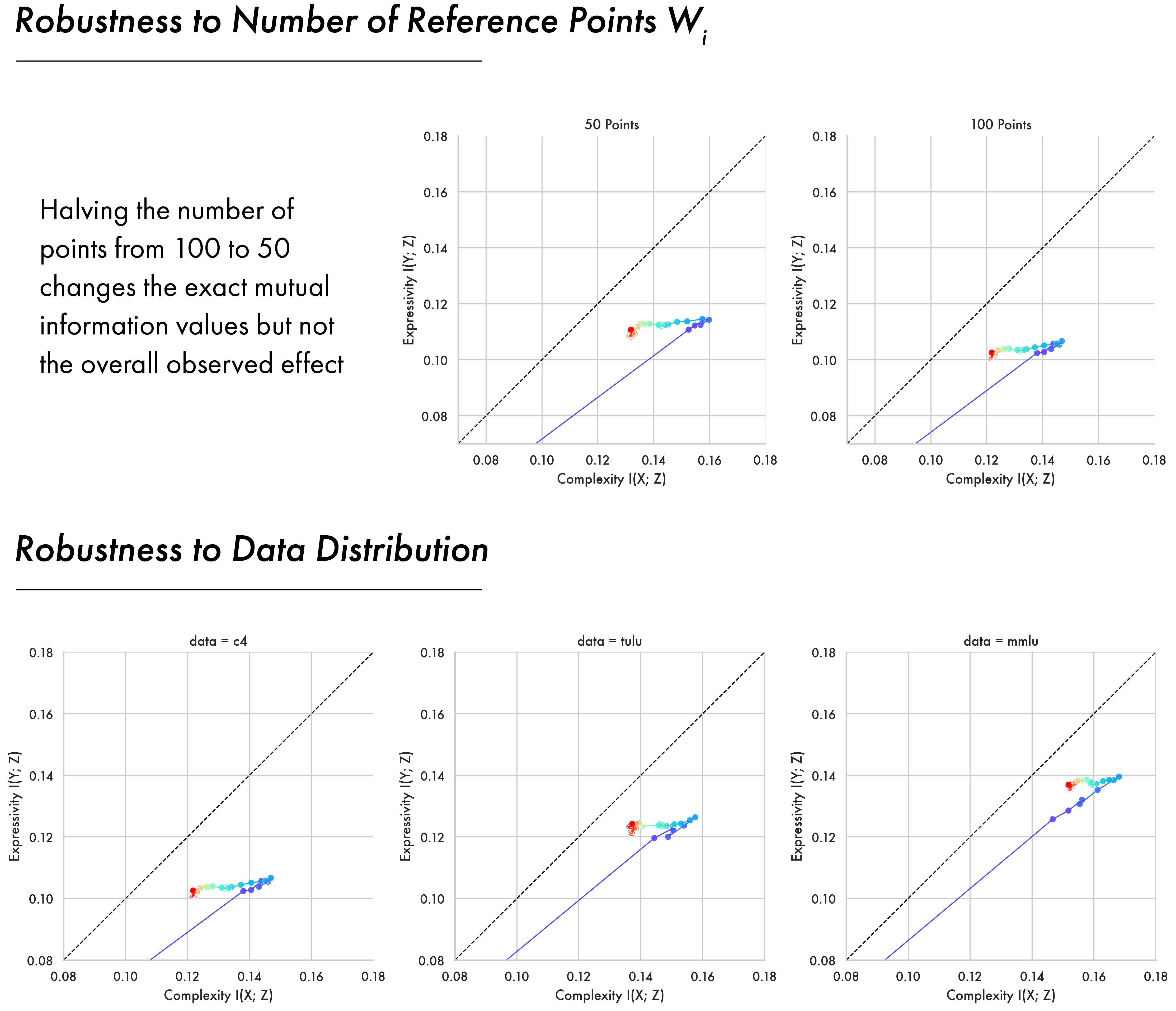 Core results in the paper show information plane trajectories computed using C4 as this dataset forms a substantive part of the pre-training data for the OLMo2 models. To verify that the overall pattern of expansion and compression is robust across data distributions we analyse the pre-training checkpoints of the OLMo2 7B model across data from C4, Tulu (Lambert et al. 2024), and MMLU (Hendrycks et al. 2020). The two-phase pattern proves consistent across all of them with a fitting phase followed by a compression phase where models approach the bound. There are individual variations for each dataset, with Tulu and MMLU having higher mutual informations than C4. This may reflect that MMLU and Tulu are more domain-specific than C4, which is a broad crawl of the internet.