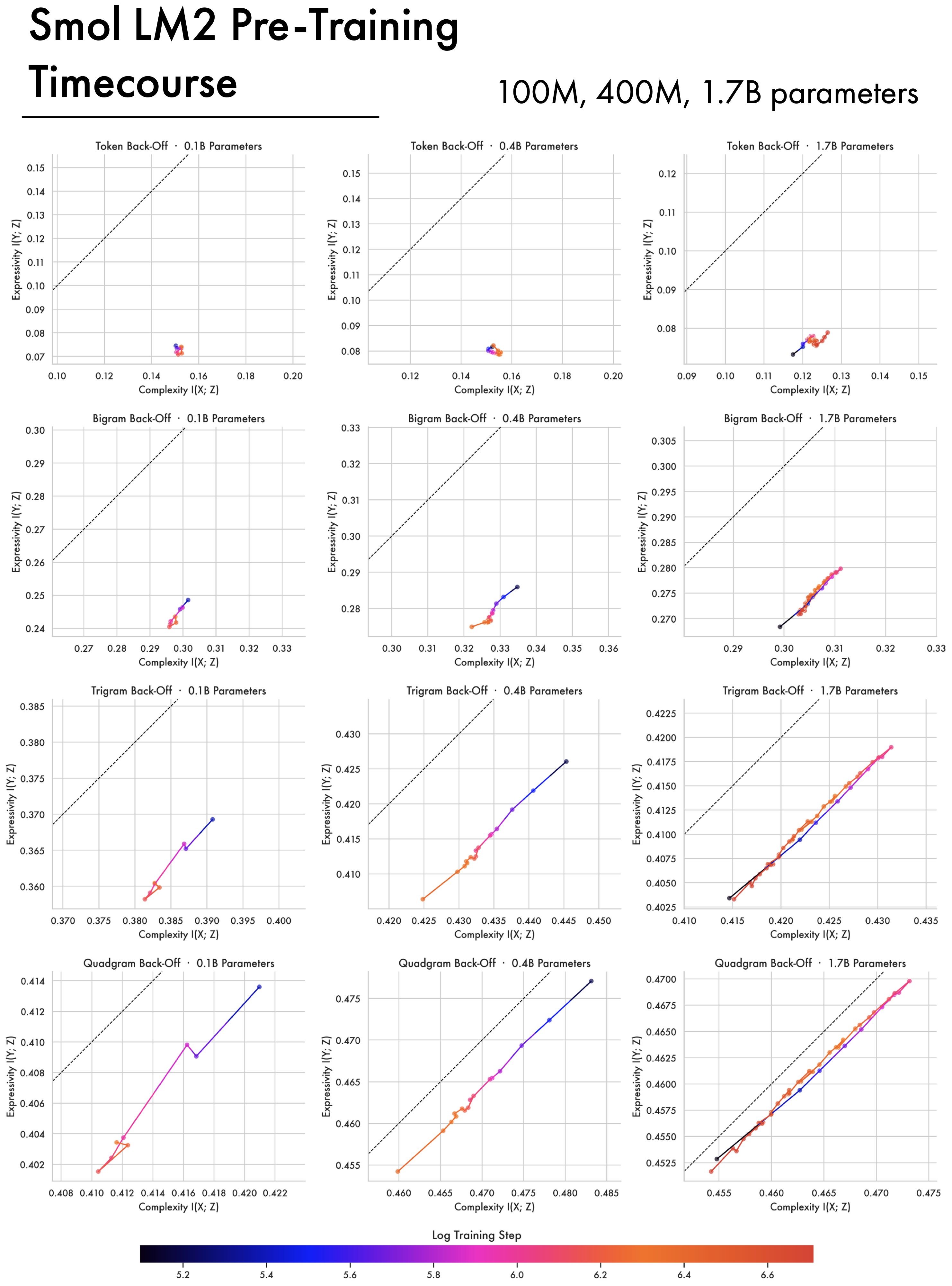 The Smol LM2 models (Allal et al. 2025) are models with 1.7B parameters or smaller that achieve competitive performance. The 1.7B Smol model was trained on 11 Trillion tokens and performs comparably to the 1B OLMo2 model which was trained on 4 Trillion Tokens. Broadly the 1.7B Smol model follows a similar training trajectory to the OLMo2 1B model, having phases of expansion and compression but failing to approach the bound like the OLMo2 7B and 32B models. This figure also includes trajectories for the smaller 100M and 400M variants — these models struggle to show much meaningful compression, though part of the issue may be that checkpointing starts comparatively late in the pre-training process.