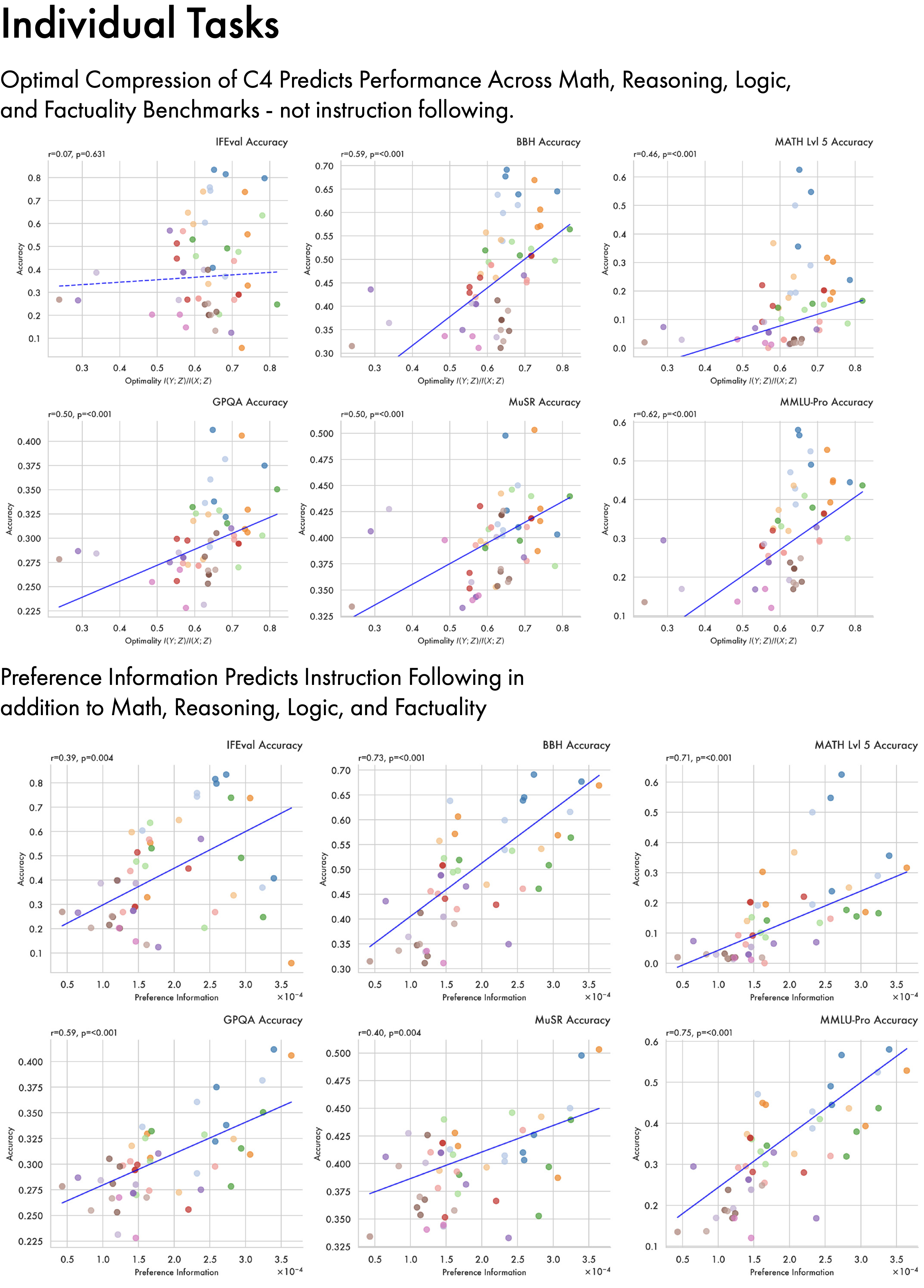 Here analysing the individual task correlations reveals a pattern. Optimal compression of C4 — a broad crawl of the internet — predicts performance across math, reasoning, and factuality benchmarks, but not IFEval (\(r=0.07, p=0.631\)). IFEval assesses a model’s ability to follow specific compositional instructions in the prompt, and performance here is predicted by the amount of preference information present in a model (\(r=0.39, p=0.004\)). This sheds light on what drives model performance: general purpose knowledge and reasoning is related to optimal compression of the training data, while instruction following is related to preference information which arises during post-training. Preference information proves predictive of math, reasoning, and factuality benchmarks as well as instruction following — but this may largely reflect the makeup of the preference data used.