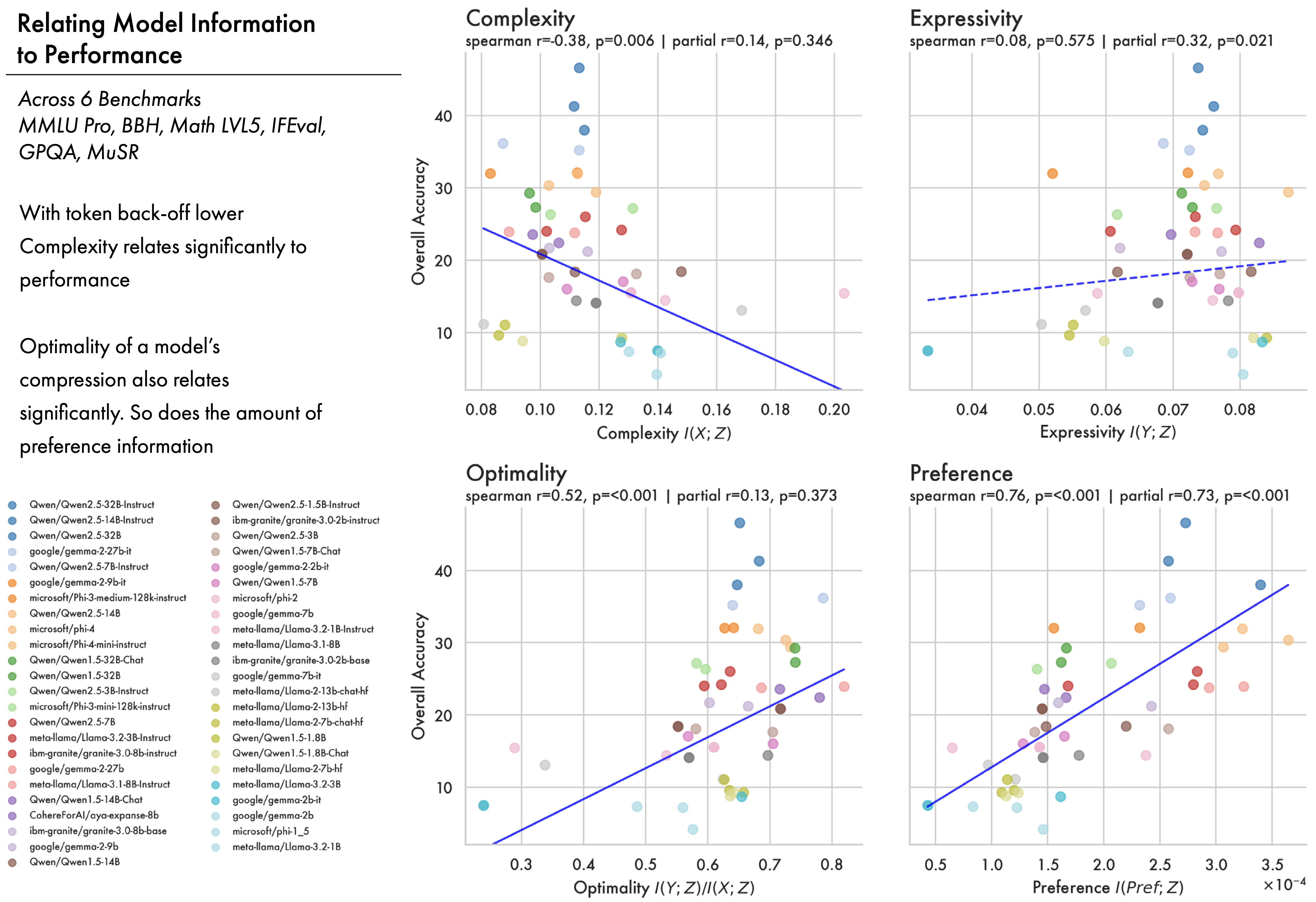 So far we have studied how information in an LLM is structured; we now consider how that structure relates to downstream performance. We look at how representational information for 47 open weights models from 6 different families relates to performance across six benchmarks (Fourrier et al. 2024): MMLU Pro, BBH, Math LVL5, IFEval, GPQA, and MuSR.